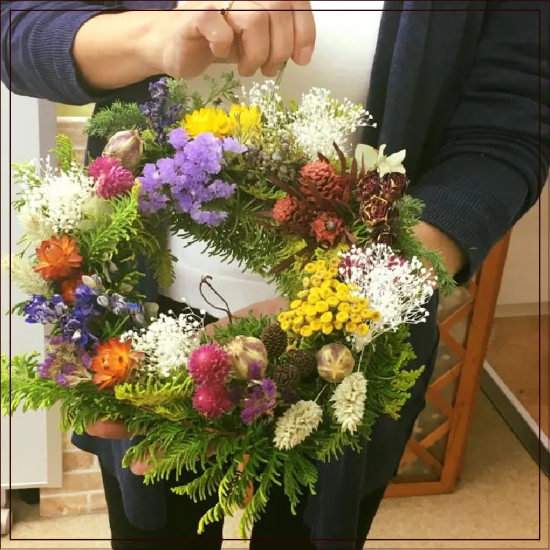 ドライフラワー・ハーブ・プリザーブドフラワーだけで仕上げる本格リース。造花(アーティフィシャルフラワー)は使わず、天然素材のみ。様々なハーブティーを飲みながら作れます。